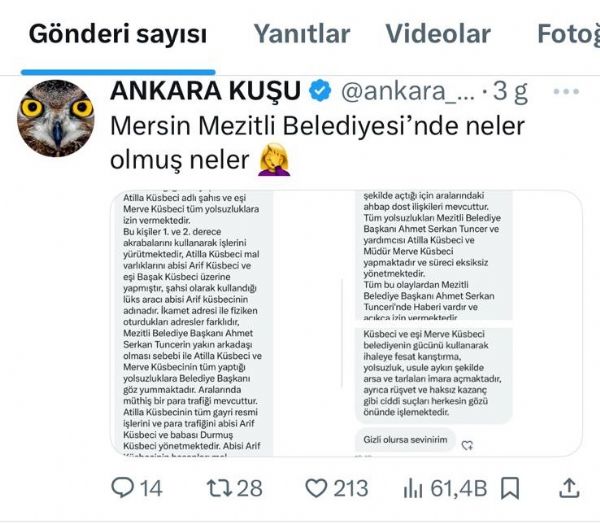 X’in önemli haber paylaşım platformu Ankara Kuşu’nun CHP’li Mezitli Belediyesi ile ilgili yaptığı paylaşım kentte şok etkisi yarattı. Ankara Kuşu, 1 milyon 200 bin kişinin takip ettiği hesaptan yaptığı paylaşımda Mezitli Belediye Başkan Yardımcısı Atilla Küsbeci ile yine aynı belediyede İmardan sorumlu müdür olarak çalışan eşi Merve Küsbeci’nin yolsuzluk yaptıklarını öne sürdü. Paylaşımda ayrıca Belediye Başkanı Ahmet Serkan Tuncer’in tüm yapılan yolsuzluklardan haberi olduğu ve ses çıkarmadığı iddia edildi. Yapılan paylaşımın üzerinden günler geçmesine rağmen CHP’li Başkan Tuncer’in sessiz kalması dikkat çekti.